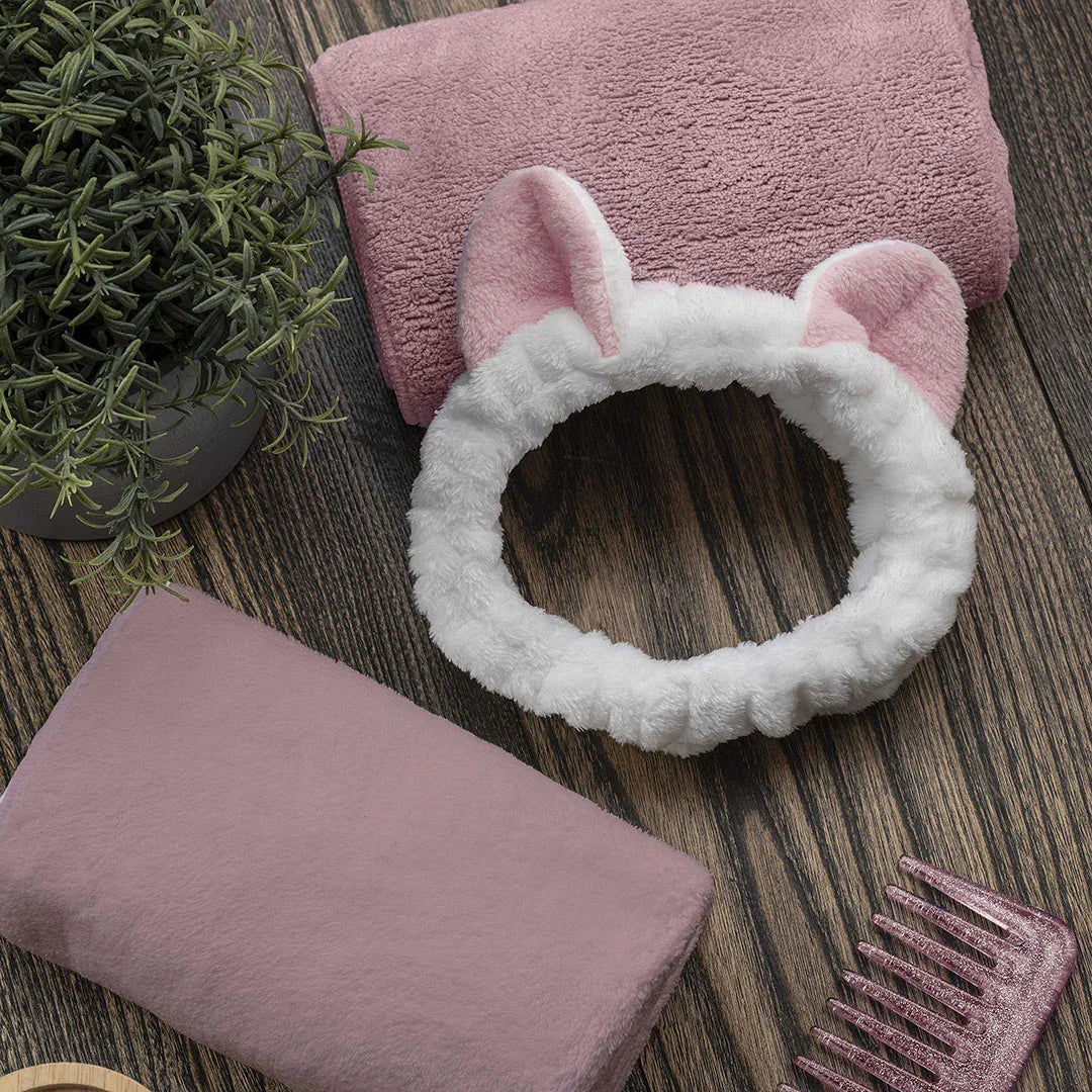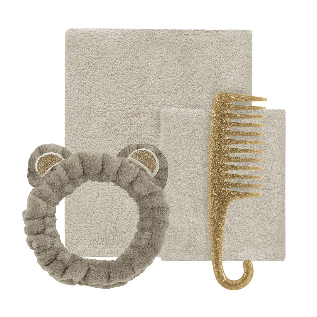 Il set comprende due asciugamani, una fascia elastica capelli, un pettine