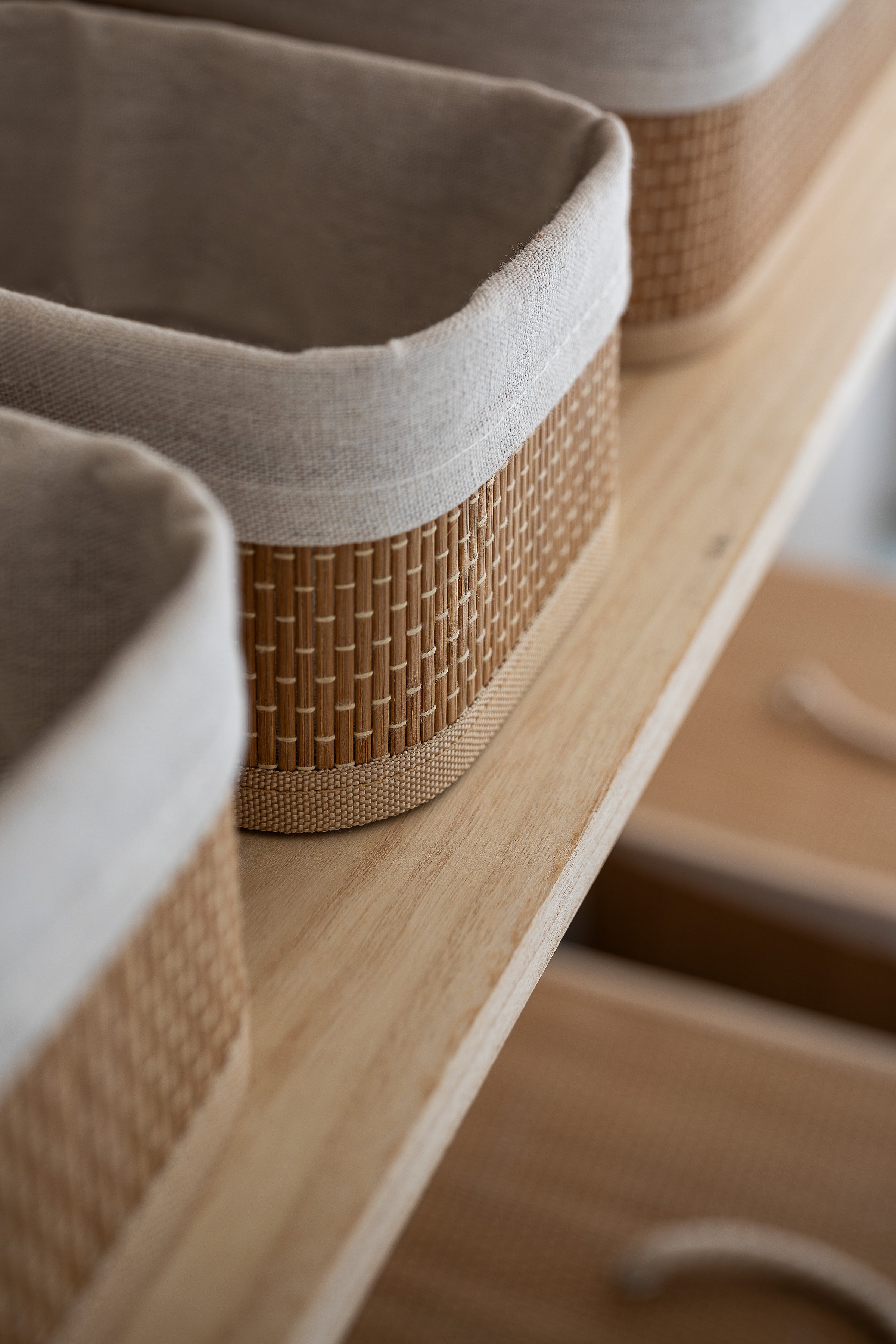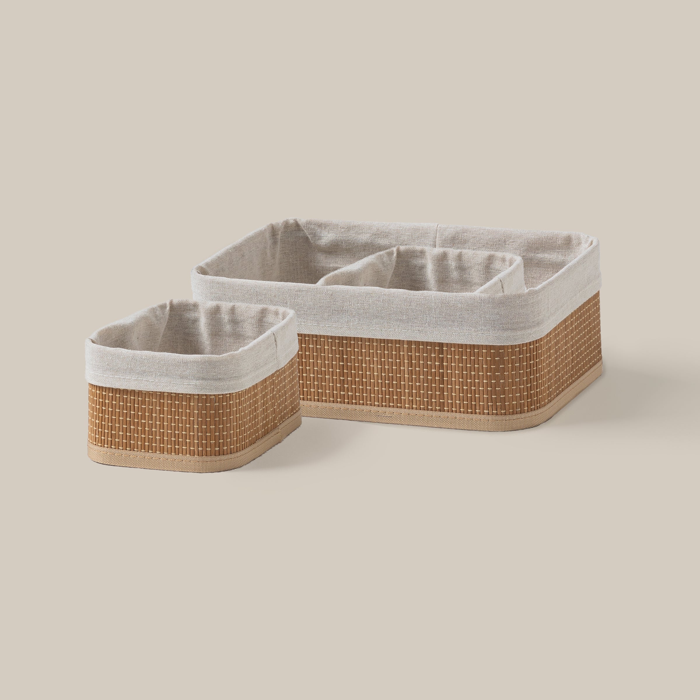 Set 3 Cestini Lavanderia in Bamboo Soft Standard: pratici ed eleganti, realizzati in bamboo naturale con design a tinta unita. Ideali per organizzare biancheria, accessori o piccoli oggetti, uniscono funzionalità e stile. Il set include 1 cesto grande da 33×23×14 cm e 2 cesti piccoli da 20×15×12 cm, perfetti per mantenere ordine in bagno, lavanderia o armadi con un tocco naturale e raffinato.