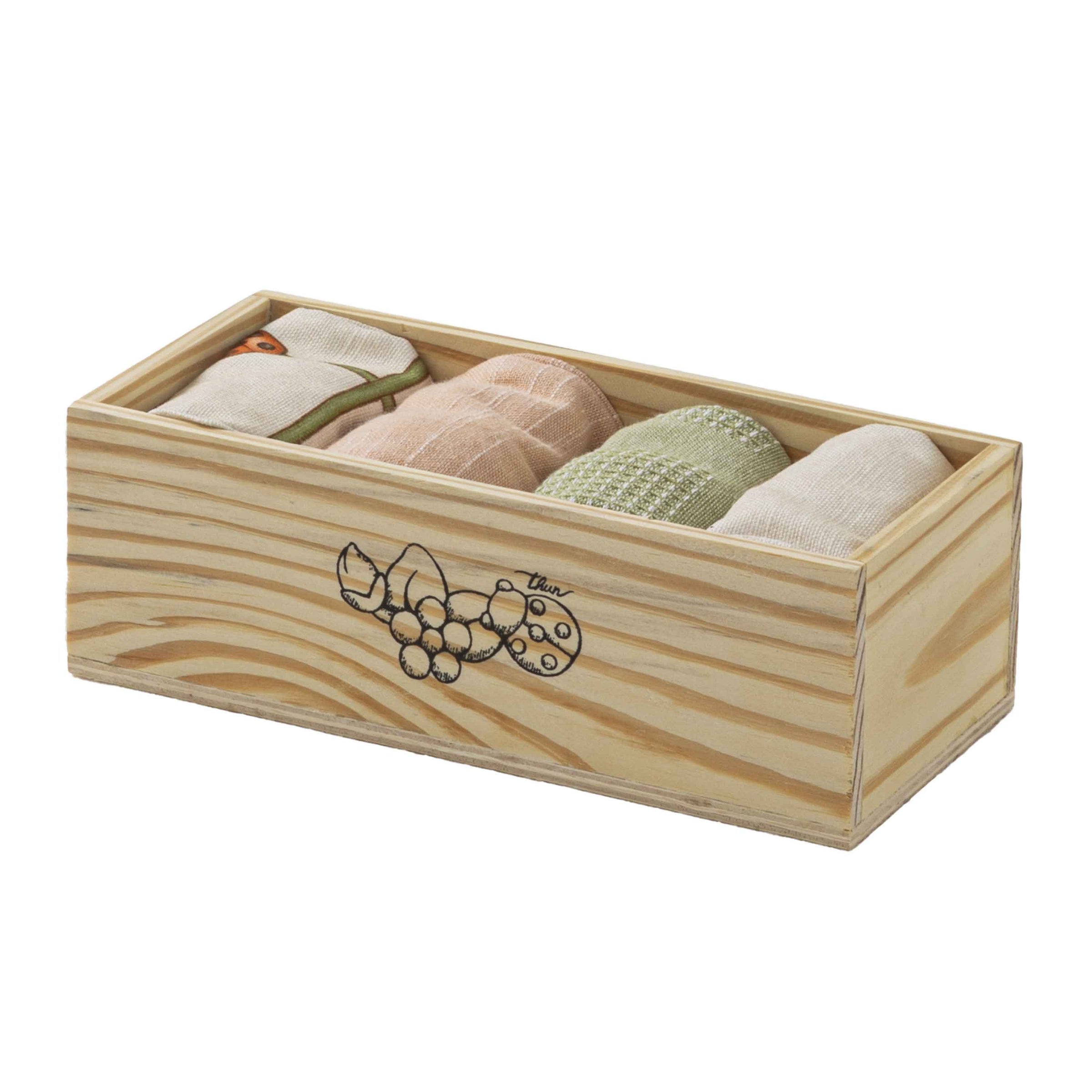 Composizione: Pratica box in legno con 4 asciugamani da cucina. 100% Cotone